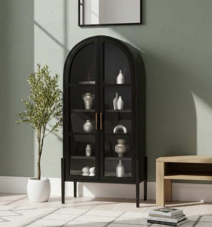 Elevate your home decor with the PRITI Wooden Display Shelf, a stunning blend of modern design and practical storage. Featuring a distinctive arched silhouette, this display shelf brings a touch of sophistication to any room. The sleek black wood frame exudes contemporary elegance, while the glass-paneled doors offer a clear view of your treasured items, ensuring they remain dust-free and beautifully showcased.