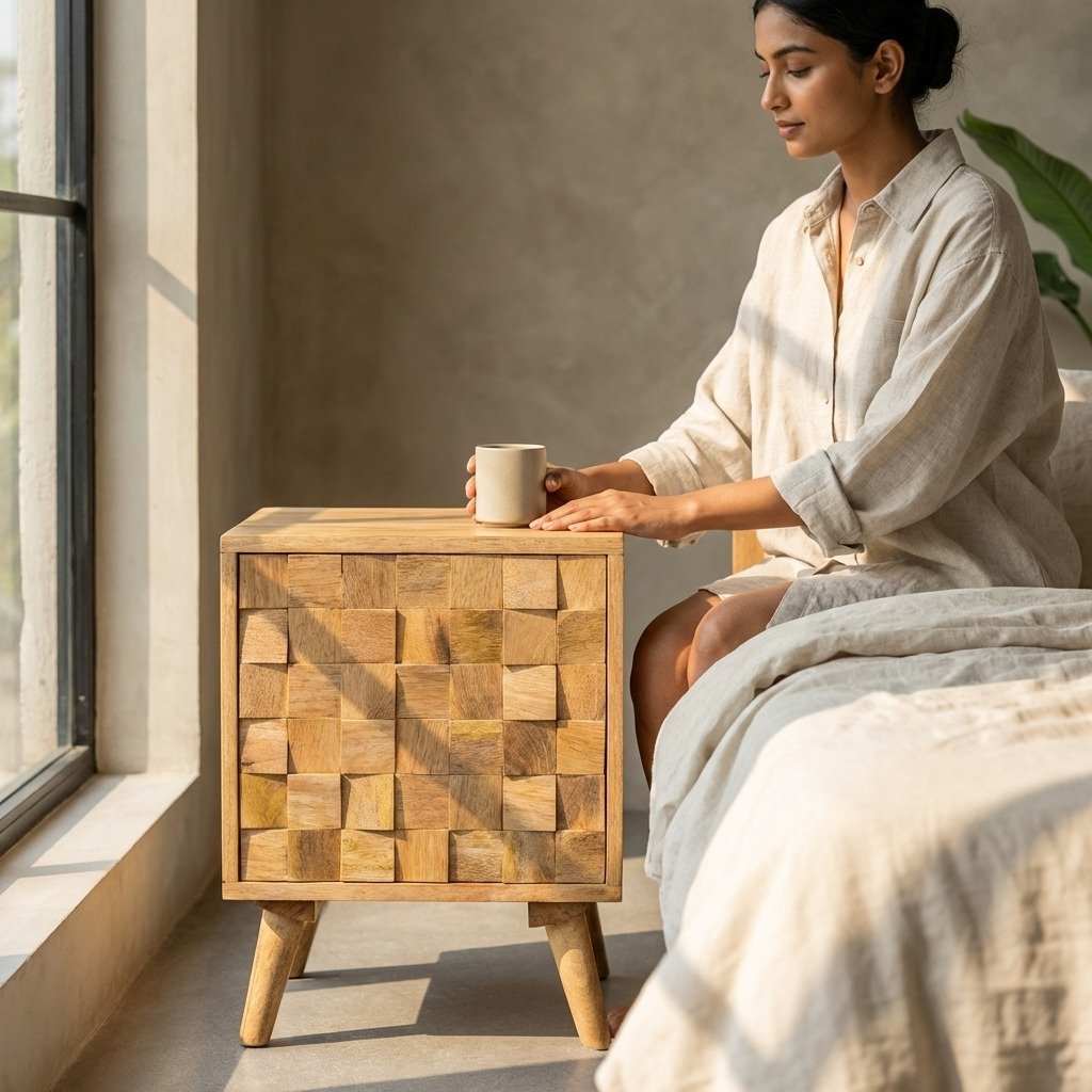 Designed to blend seamlessly with various bedroom styles, from modern to rustic, the PRITI Wooden Nightstand offers versatility and elegance. Its natural wood finish ranges from warm browns and golds to deeper hues, showcasing the rich variety of tones that make each piece truly one-of-a-kind. The organic beauty of the wood grain and the mosaic detailing give this nightstand a distinctive character, creating a cozy and inviting atmosphere in your most intimate space.