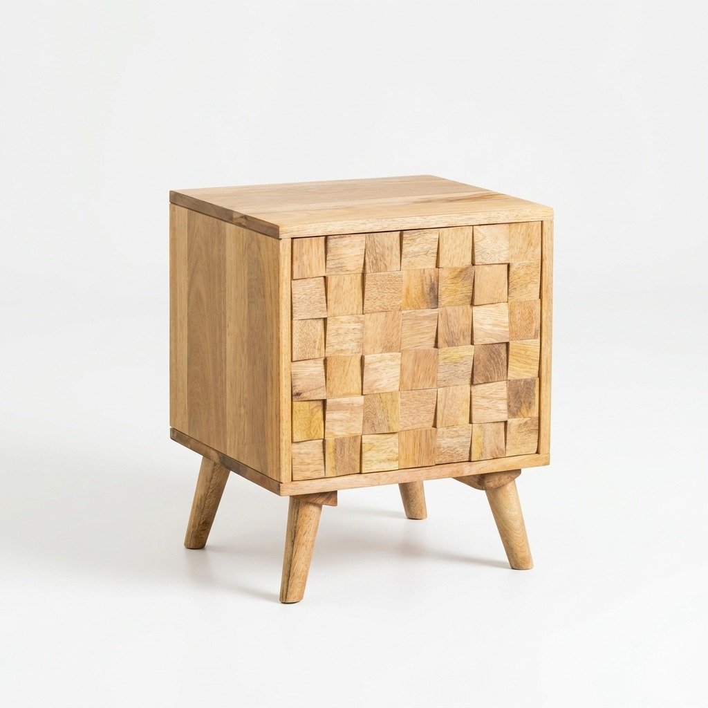 The PRITI Wooden Nightstand is a beautifully designed piece that brings both functionality and charm to your bedroom. Crafted from 100% solid wood, this nightstand exudes durability and showcases the natural beauty of its material. Its rectangular shape is enhanced by the unique mosaic-style front, featuring small squares in relief that add texture and visual appeal. This intricate design not only sets it apart but also adds a touch of sophistication to any bedroom setting.
