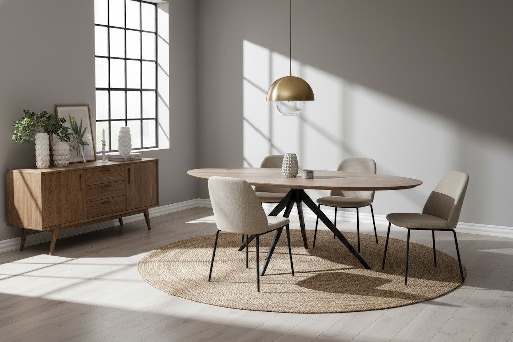 Supporting the tabletop is a sturdy metal spider leg in a matte black color, which adds an industrial touch while ensuring stability and strength. This combination of solid wood and metal not only provides a stylish contrast but also ensures the table is built to withstand daily use.PRITI Wooden Ovel Dining Table