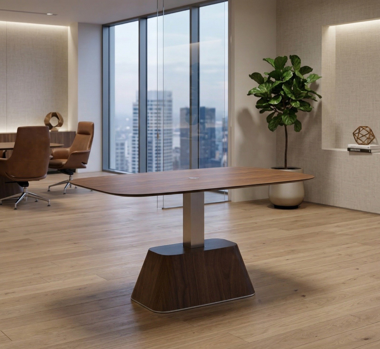 The organically shaped solid wood tabletop offers a natural aesthetic that brings warmth and character to any space. It rests on a sturdy base, inside which slides a mat with a satin nickel finish, adding a touch of modern elegance. This exclusive design provides both flexibility and timeless appeal, making it an ideal solution for dynamic, multifunctional living spaces.