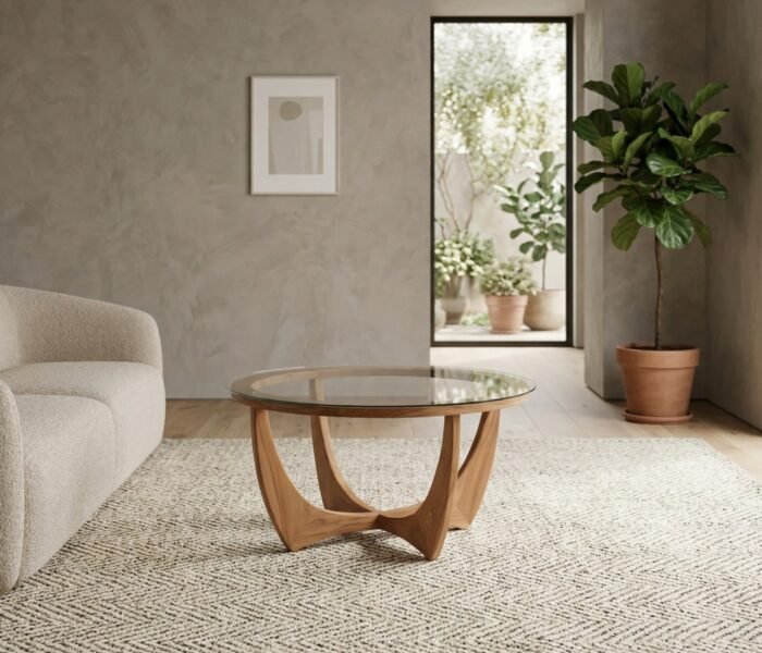 Design and Aesthetics: The PRITI Round Brown Wooden with Glass Coffee Table features a clean and minimalist design with a round glass tabletop that exudes a modern charm. The rich brown glass top adds a warm and luxurious touch, creating a visually striking contrast against various interior styles. The table’s sleek, circular form enhances its visual appeal while providing a smooth, uninterrupted surface that complements both modern and traditional decor.