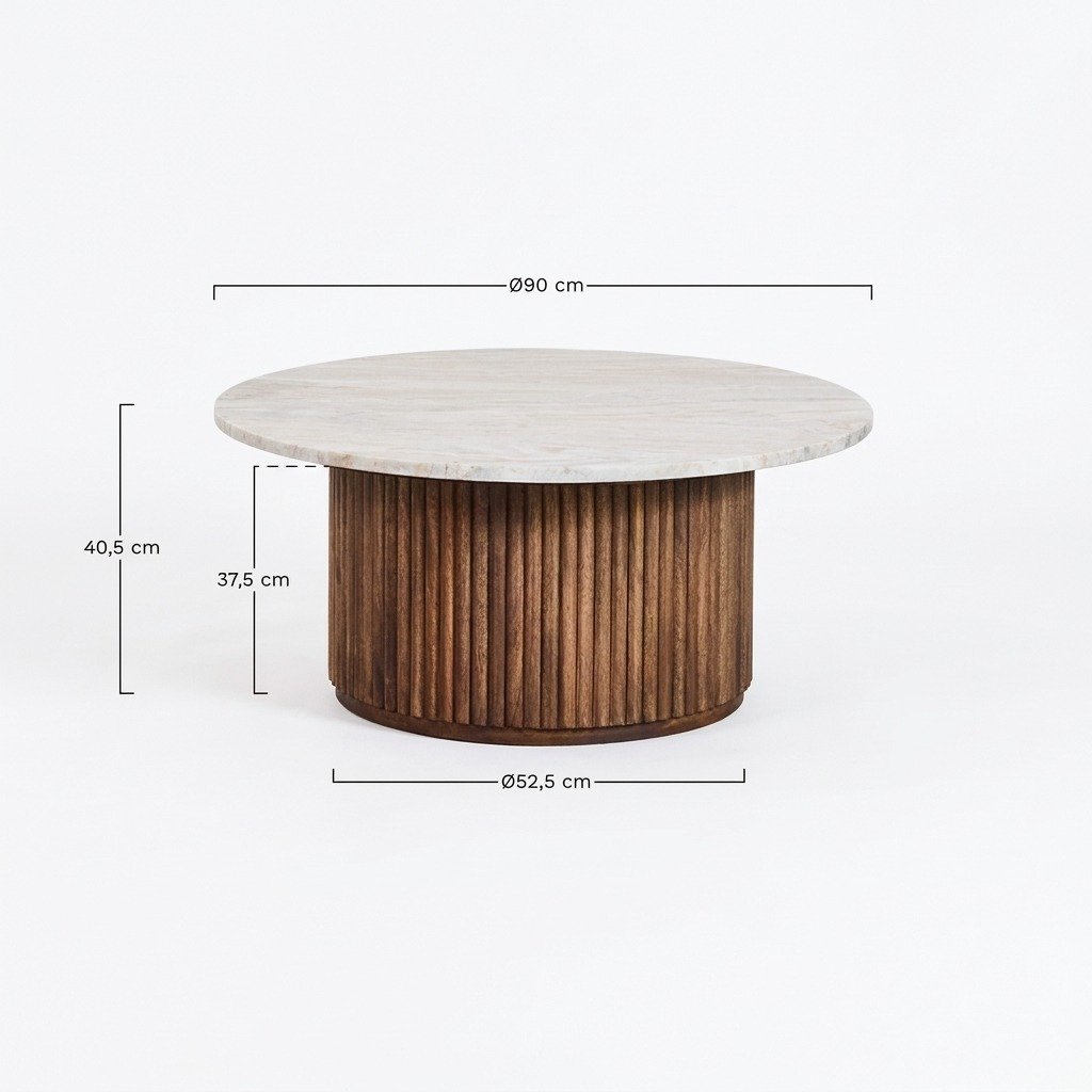 Wood can have a wide variety of shades due to its characteristics. We can find shades of brown or gold, yellow and red, and you can even find darker parts with gray or black tones. This range of colors is part of the natural beauty of this type of wood and makes each piece of furniture unique, and there may always be differences in color tone from one to another. For proper maintenance, we recommend avoiding the use of sharp objects and cleaning the dust with a soft, dry cloth, avoiding the use of chemical products.PRITI Round Marble and Wood Coffee Table