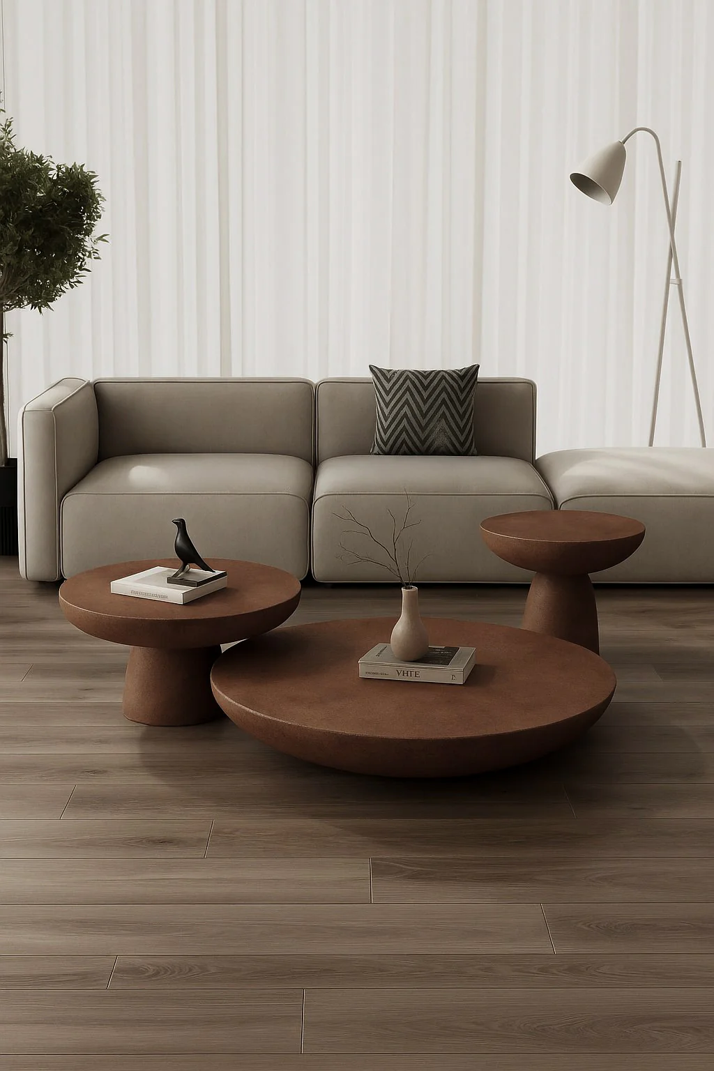 Transform your living space into a refined gallery of modern minimalism with this striking mocha brown round coffee table set, designed to bring artistic elegance and contemporary warmth into your home. Finished in a rich micro-concrete texture, each table features a sculptural silhouette that creates visual interest while maintaining a clean, minimalist aesthetic. The earthy mocha tone adds depth and warmth, making this set an inviting centerpiece for both bold and neutral interiors.