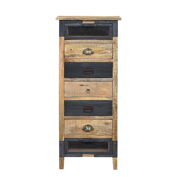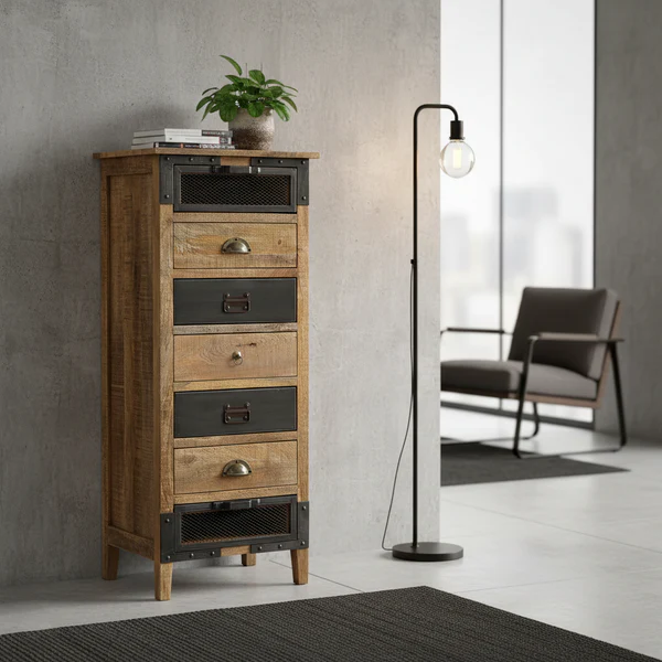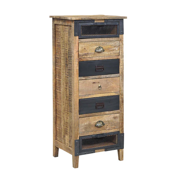 Comme son nom l’indique, ce semainier en manguier massif dispose de sept tiroirs, idéals pour organiser le linge, les accessoires ou les objets du quotidien. L’alternance subtile entre le bois naturel et les façades en métal noir apporte une touche industrielle élégante, parfaitement équilibrée par la teinte miel chaleureuse du manguier. Ce contraste crée un design épuré et contemporain, inspiré de l’univers des ateliers revisités.