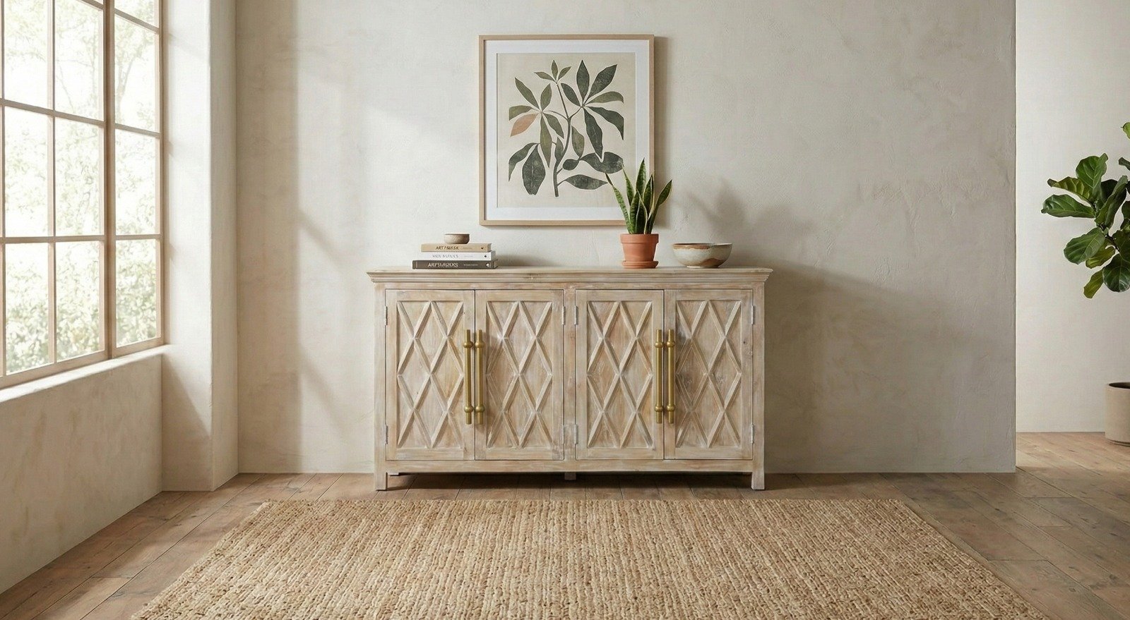 Design: The standout feature of this sideboard is the intricately carved diamond pattern across the front doors. This geometric detailing adds depth and visual interest, turning the sideboard into a statement piece for any interior.
