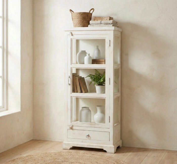 With dimensions of 58 cm width × 140 cm height, this cabinet is perfectly proportioned for narrow spaces, making it an excellent solution for corners, hallways, or compact living areas. Its light, neutral finish and natural mango wood tones lend warmth while ensuring the piece blends seamlessly with any color palette or décor theme.