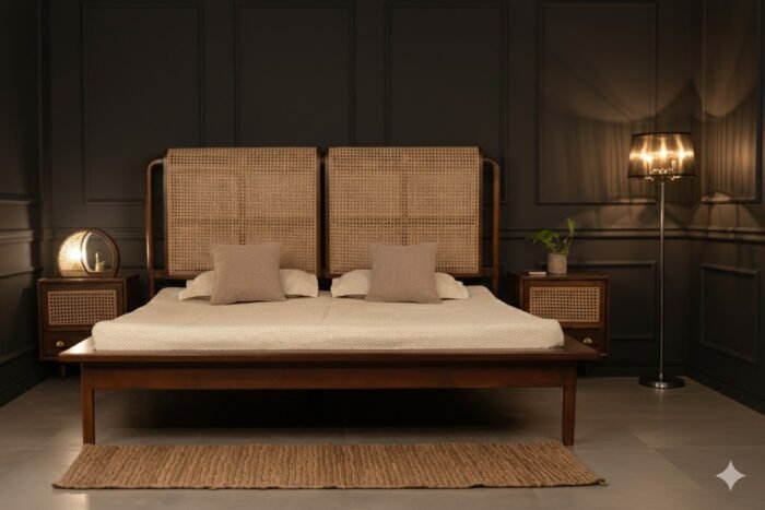 The Soho rattan teak wood bed is a perfect blend of natural elegance, artisanal craftsmanship, and long-lasting strength. Made from premium solid teak wood combined with handwoven natural rattan, this bed brings warmth, texture, and character to any bedroom interior. Teak wood is known for its exceptional durability, resistance to moisture, and rich grain pattern, making this bed not only beautiful but also highly practical for everyday use. The airy rattan panels add natural ventilation to the headboard and footboard, keeping the bed fresh and comfortable in all seasons.