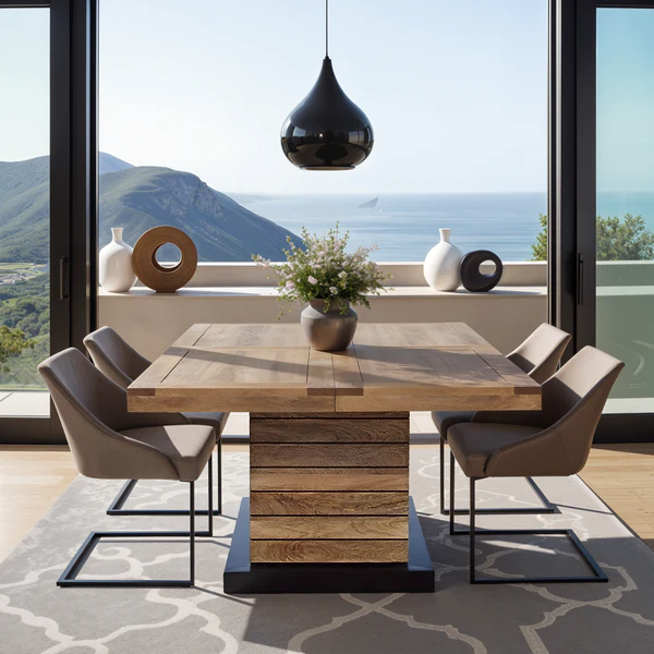 Imagine pairing this table with a fan-style pendant light with large wooden blades to complete an exotic, refined interior. With its simple, elegant lines, this table serves as a focal point of your living room or dining space, harmonizing effortlessly with both modern and colonial-inspired décor. To complete the look, combine it with chairs from the same collection, creating a cohesive and luxurious dining environment.