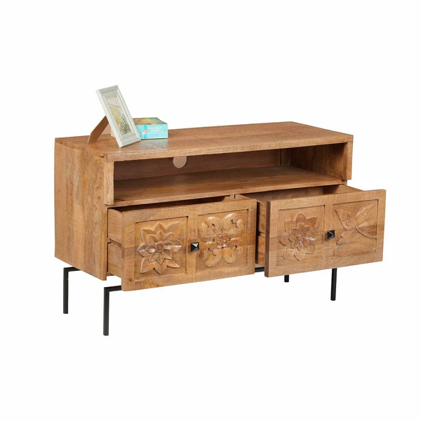 The hand-carved drawer fronts, crafted from thick 2.5 cm solid wood panels, are adorned with elegant floral motifs that reflect outstanding artisanal craftsmanship. These refined details bring an artistic and sophisticated dimension to the piece, elevating it far beyond a conventional TV stand. The sturdy 1.5 cm thick wooden frame ensures excellent structural stability and long-lasting performance. solid mango wood TV stand-Priti