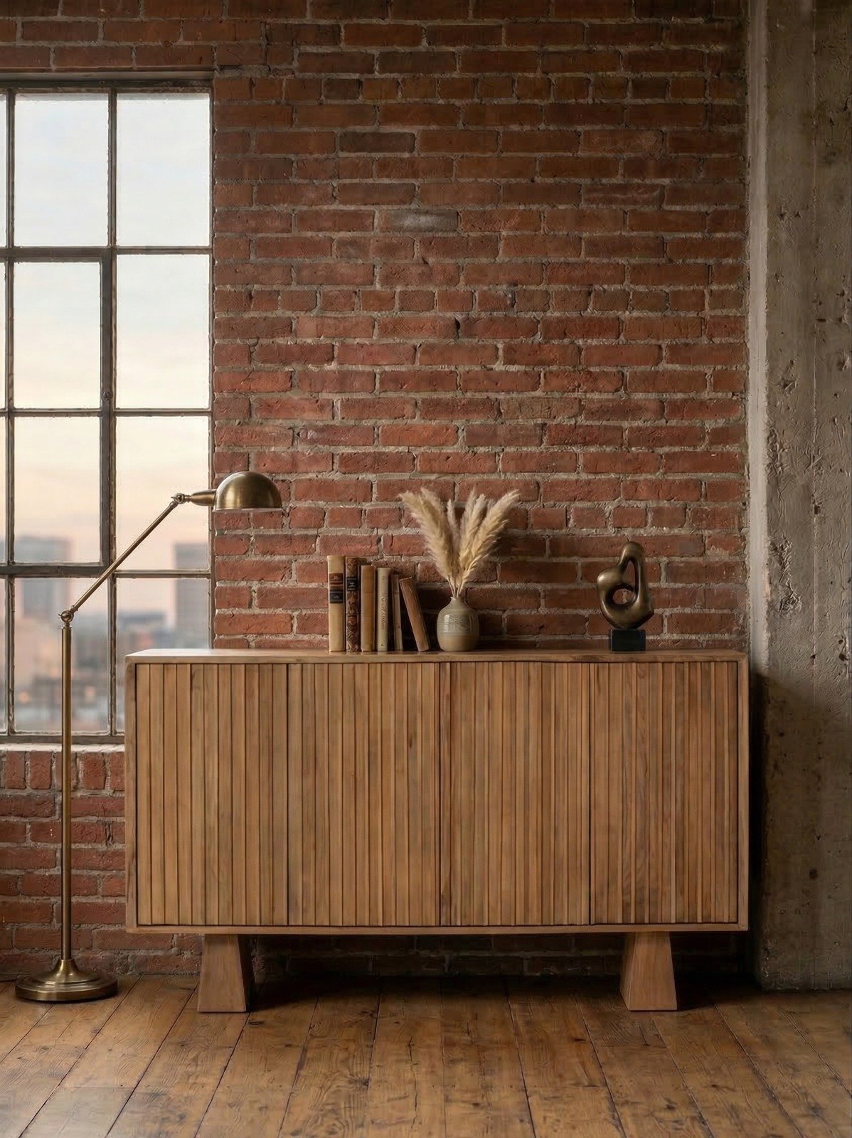 Bold Structure: Supported by sturdy trapezoid-shaped legs, offering a stable foundation and a distinctive, grounded silhouette. Solid Wood 4-Door Sideboard Cabinet