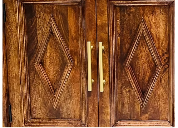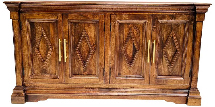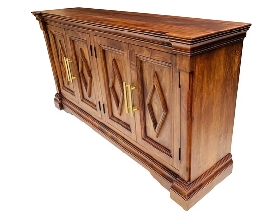 Add timeless elegance to your home with this beautifully crafted solid wood sideboard featuring intricate diamond carved doors and sleek brass handles. Designed with both style and functionality in mind, this cabinet offers ample storage space for your dining essentials, tableware, or living room accessories. Its rich natural wood finish highlights the unique grain patterns, making each piece one of a kind.Solid Wood Diamond Carved Sideboard with Brass Handles