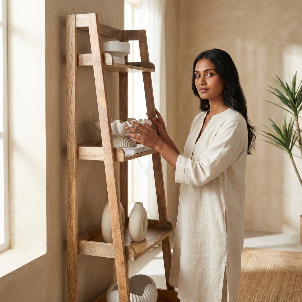 Bring elegance and practicality into your home with this beautifully designed ladder-style shelf. Handcrafted from solid mango wood, it combines timeless durability with a stylish, contemporary silhouette. Its natural finish and versatile design make it the perfect choice for modern, rustic, or minimalist interiors.