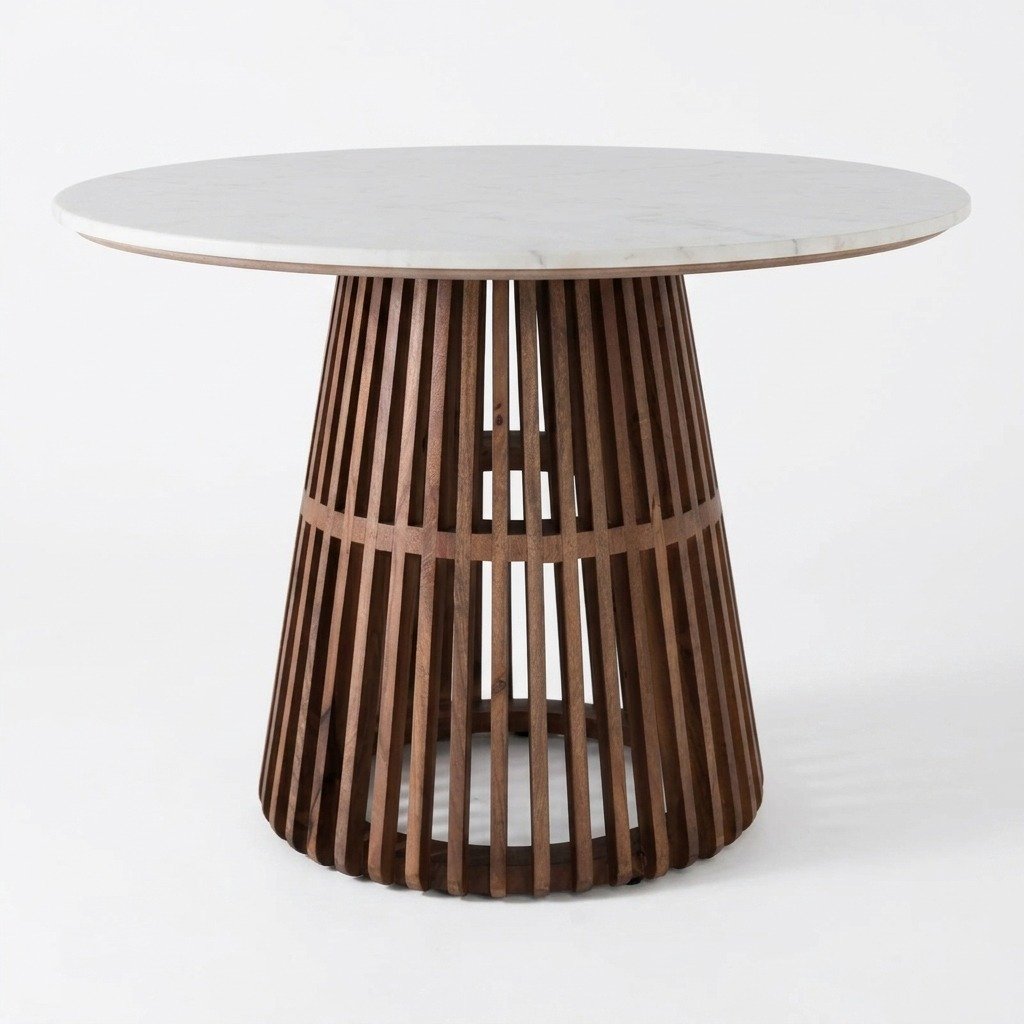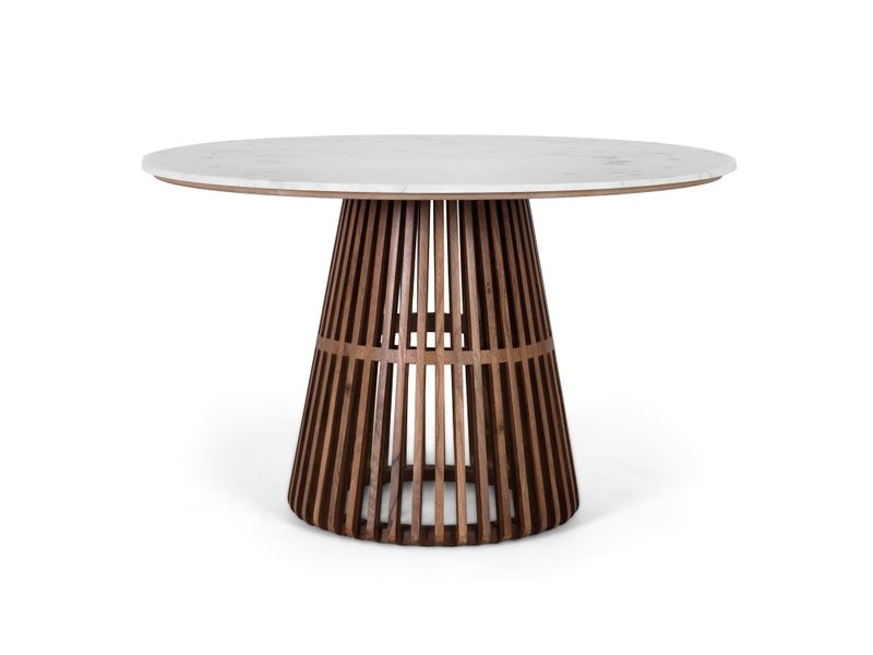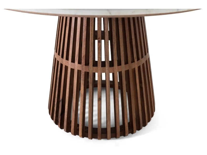 La base en bois de manguier massif se distingue par sa structure originale composée de lattes verticales disposées en forme de cône inversé. Ce design sculptural confère à la table une présence visuelle légère, tout en assurant une excellente stabilité. Le contraste harmonieux entre le marbre blanc et le bois couleur noisette crée une atmosphère chaleureuse et sophistiquée, parfaitement adaptée aux intérieurs modernes, scandinaves ou minimalistes.