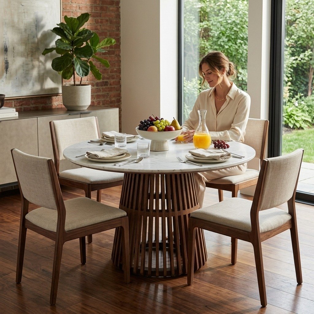 Cette table à manger ronde en marbre et bois de manguier incarne l’équilibre parfait entre élégance, design contemporain et matériaux naturels. Son plateau en marbre clair, au profil fin et au bord net, apporte une luminosité raffinée à l’ensemble et sublime instantanément votre salle à manger. Le marbre blanc, noble et intemporel, offre une surface élégante et résistante, idéale pour un usage quotidien comme pour les repas de réception.