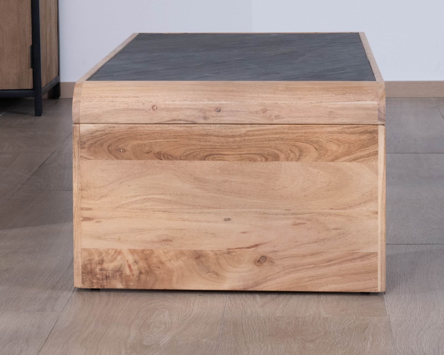 Cette table basse rectangulaire présente des dimensions optimales de 120,5 cm de longueur, 60 cm de largeur et 40 cm de hauteur, s’adaptant facilement à tous les espaces de vie. Son plateau en pierre de 104,5 x 57 cm, d’une épaisseur de 1,5 cm (5 cm en façade), assure une surface résistante pour vos objets décoratifs, vos livres ou vos boissons. Table basse en acacia massif avec
