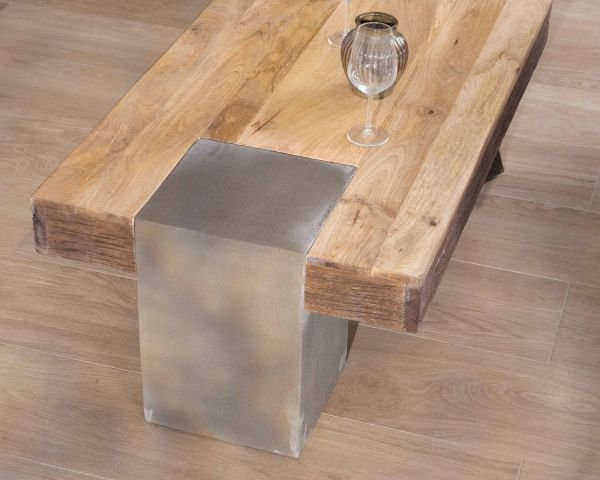 Un pied avec placage ciment, massif et imposant, ajoute une touche minérale et architecturale. Table basse industrielle en