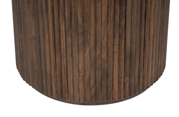 Le plateau repose sur un piètement sculptural en bois massif de manguier, aux lignes cylindriques soulignées par un motif de rainures verticales, apportant profondeur visuelle et caractère architectural. Les tonalités chaudes du bois contrastent élégamment avec la fraîcheur du marbre, créant un équilibre parfait entre matériaux nobles et design contemporain. La solidité du bois de manguier assure stabilité et longévité, faisant de cette table basse Kfir un meuble fiable et durable pour votre salon. table basse Kfir marble Top