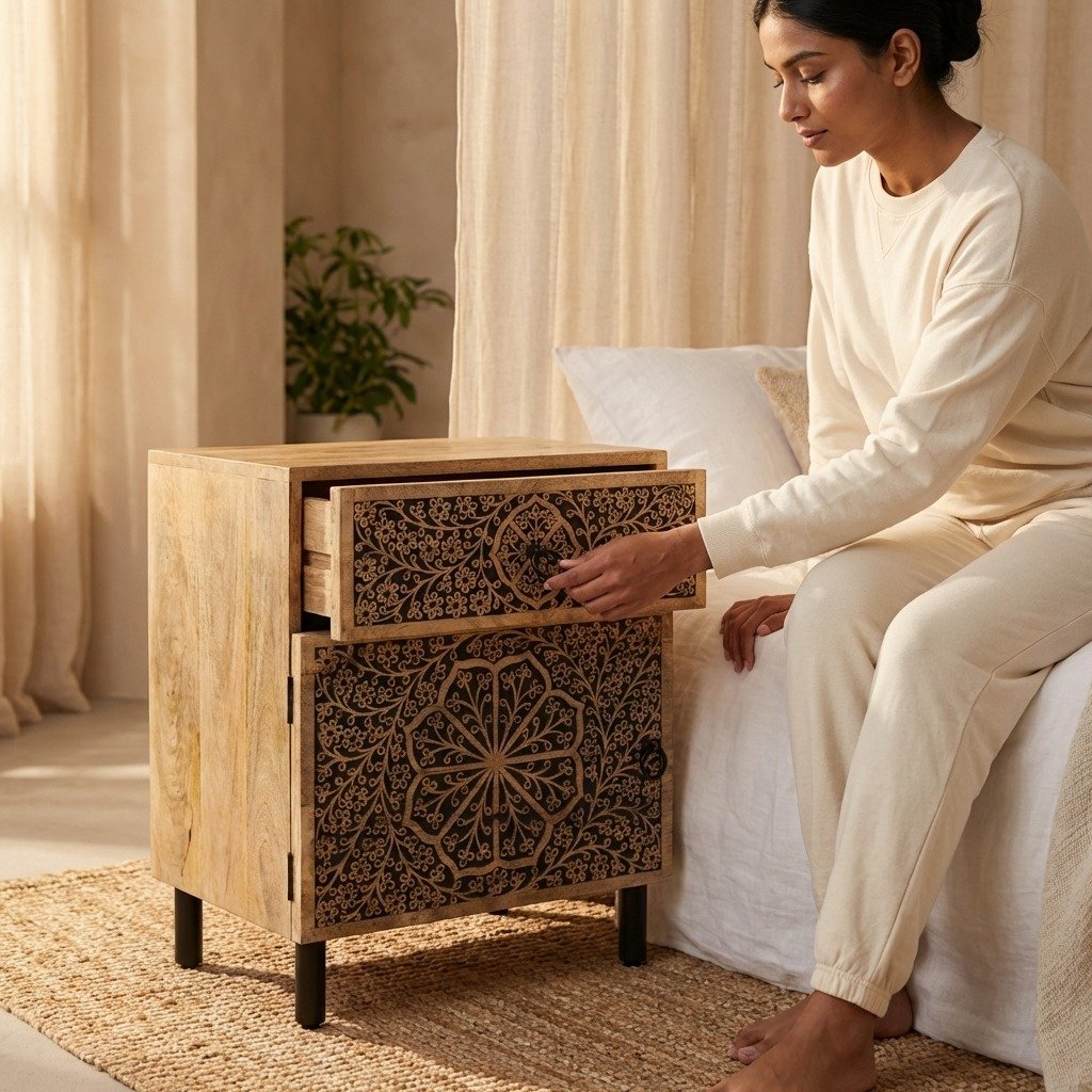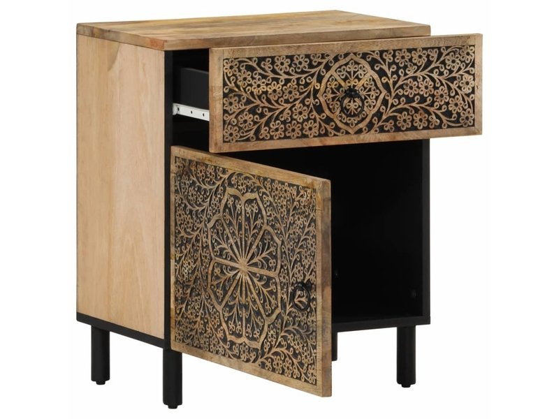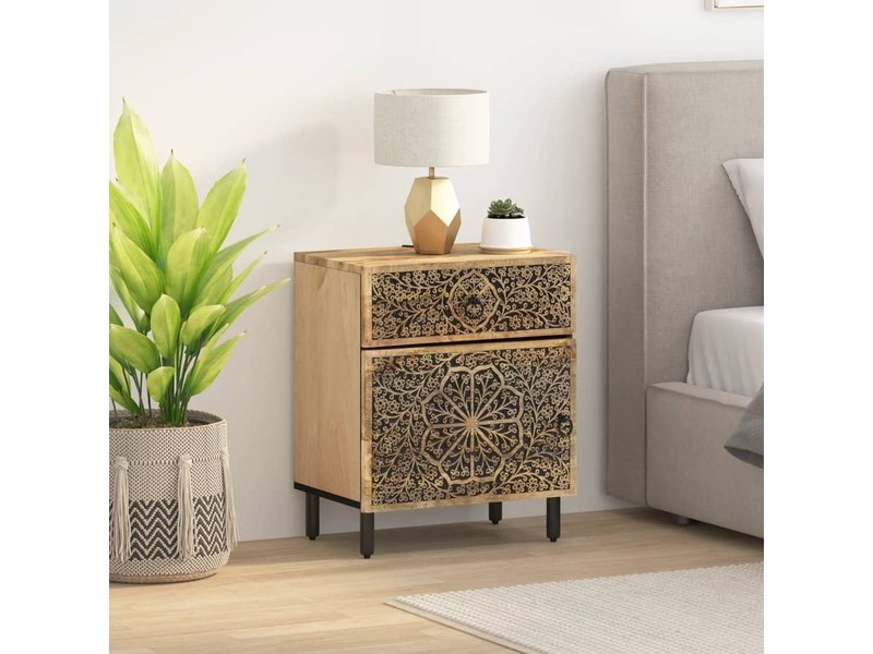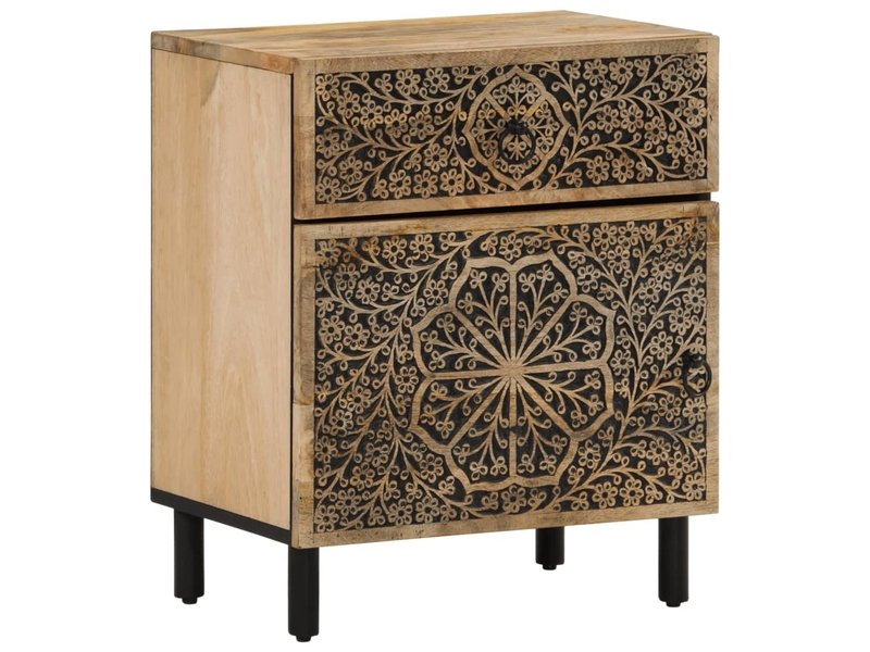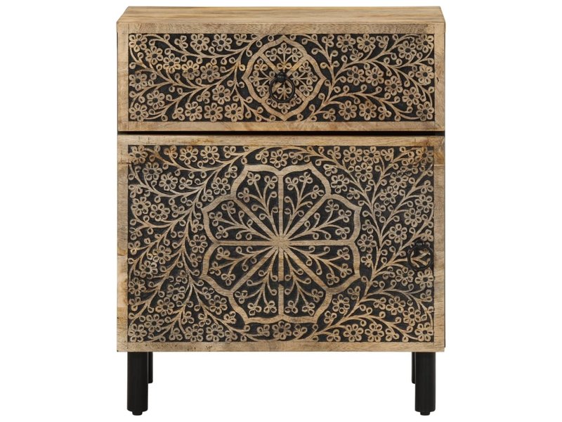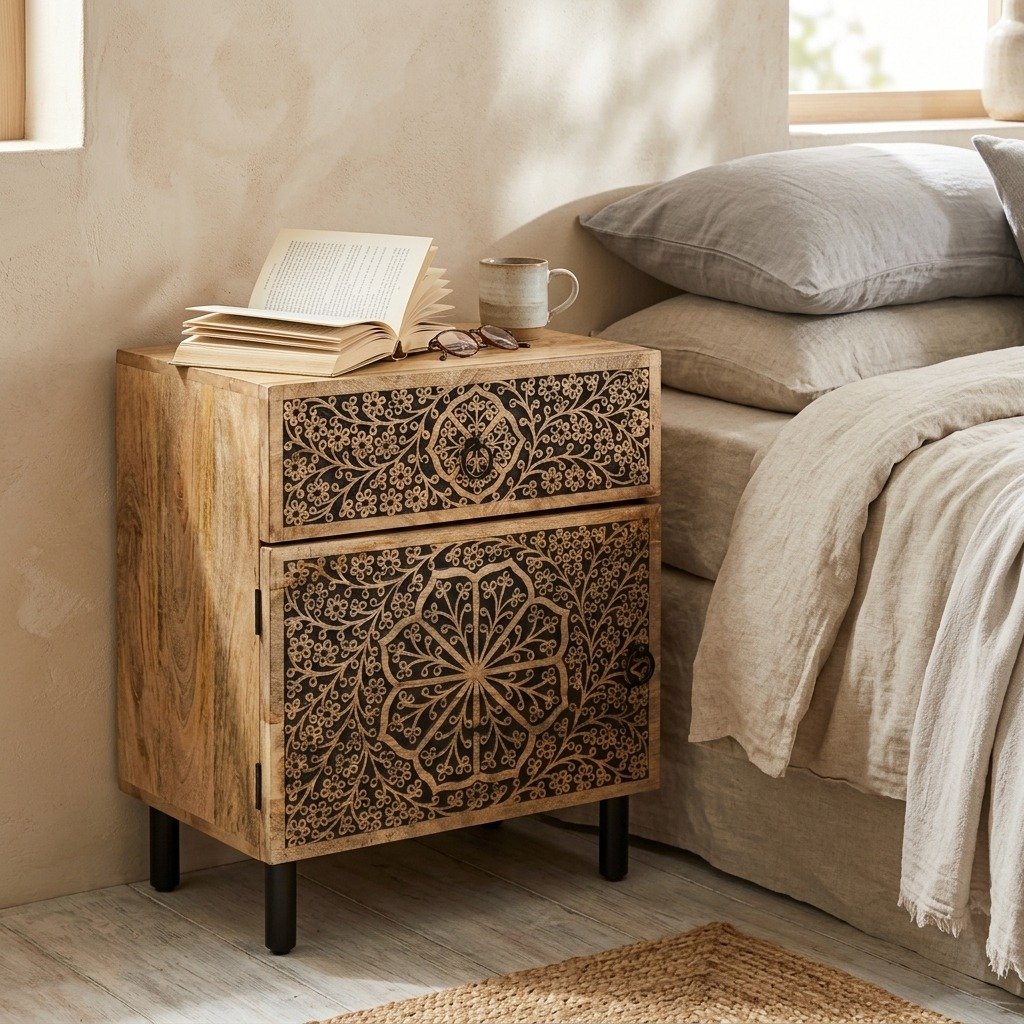Les pieds en fer robustes assurent une excellente stabilité tout en ajoutant une touche industrielle subtile qui contraste élégamment avec la chaleur du bois. Le véritable point fort de ce meuble réside dans ses motifs floraux sculptés à la main, qui apportent une dimension artisanale et un style rétro luxueux, faisant de cette table de chevet un véritable élément central de la chambre.