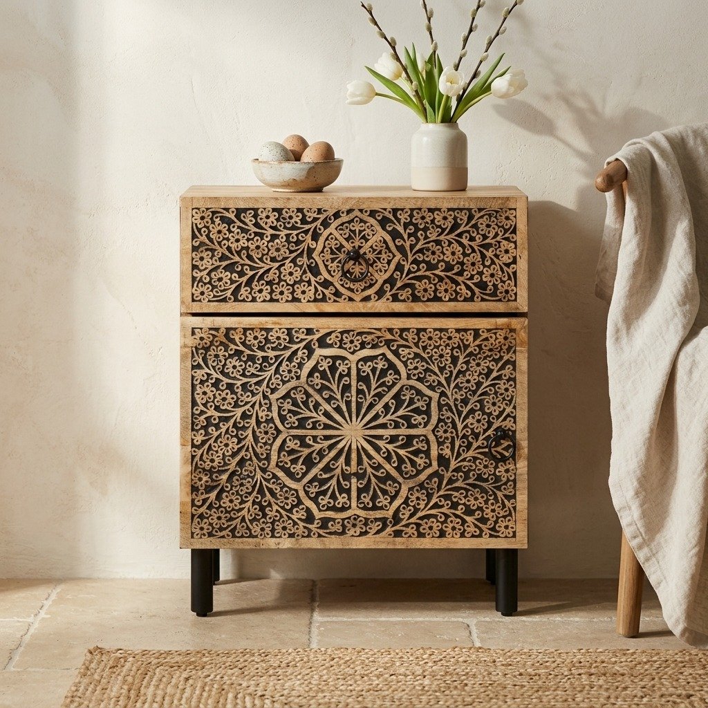 Polyvalente, cette table de chevet en bois de manguier massif sculpté s’intègre parfaitement dans des intérieurs rétro, bohèmes, classiques ou contemporains. Chaque pièce étant unique, les variations naturelles de teinte et de grain garantissent un meuble au charme incomparable. Pour plus de sécurité, un dispositif de fixation murale est fourni afin d’éviter tout basculement.