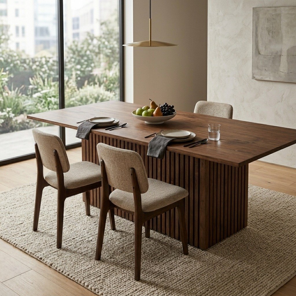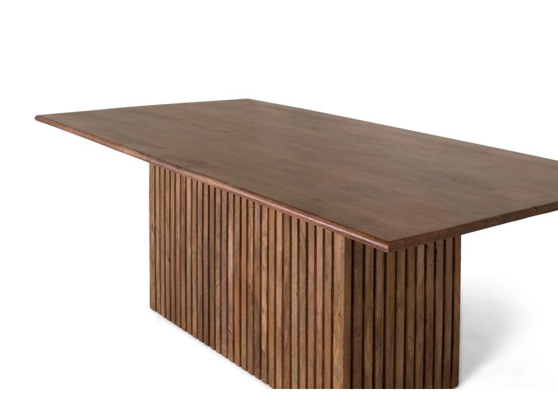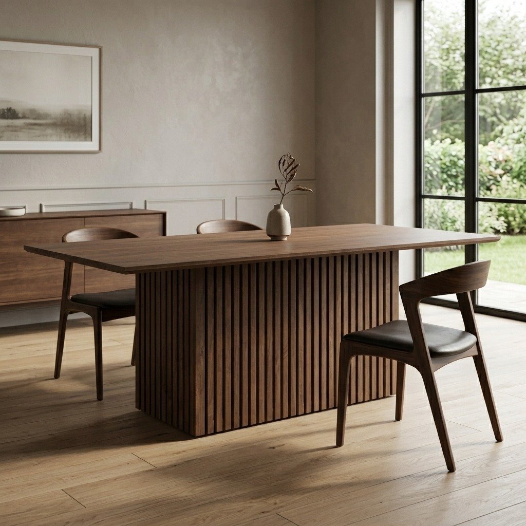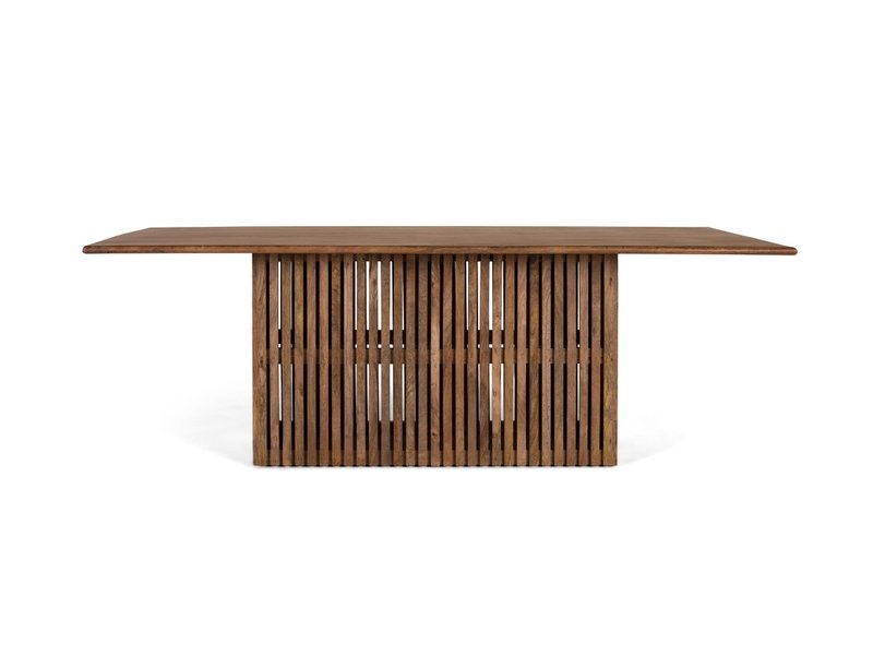 Son plateau rectangulaire aux bords arrondis offre une finition douce et élégante, idéale pour créer une ambiance conviviale et accueillante dans une salle à manger moderne ou rustique-chic. La base centrale, conçue comme un bloc rectangulaire habillé de lattes verticales, ajoute du relief et une dimension sculpturale au meuble, tout en assurant une excellente stabilité. Cette conception intelligente libère l’espace autour de la table, garantissant un confort optimal pour les convives et une grande praticité au quotidien.