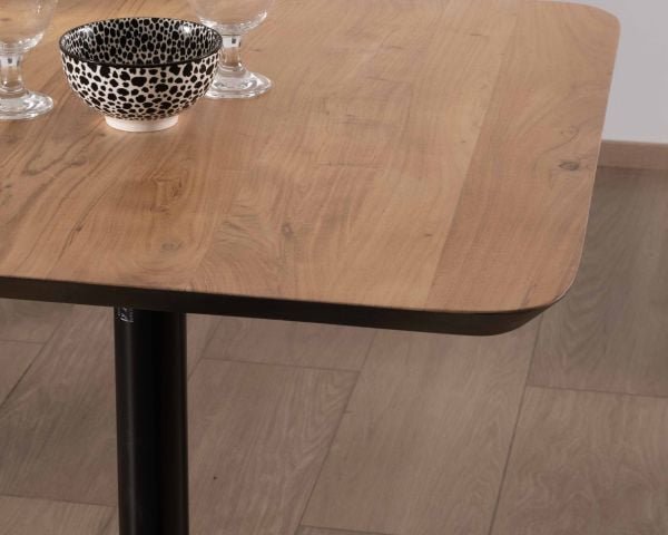 Le pied central, stable et solide (diamètre 7,5 cm), posé sur un large socle métallique de 47,5 cm, assure une excellente tenue tout en optimisant l’espace autour de la table. Le repose-pieds intégré apporte un confort supplémentaire lors des moments de partage.