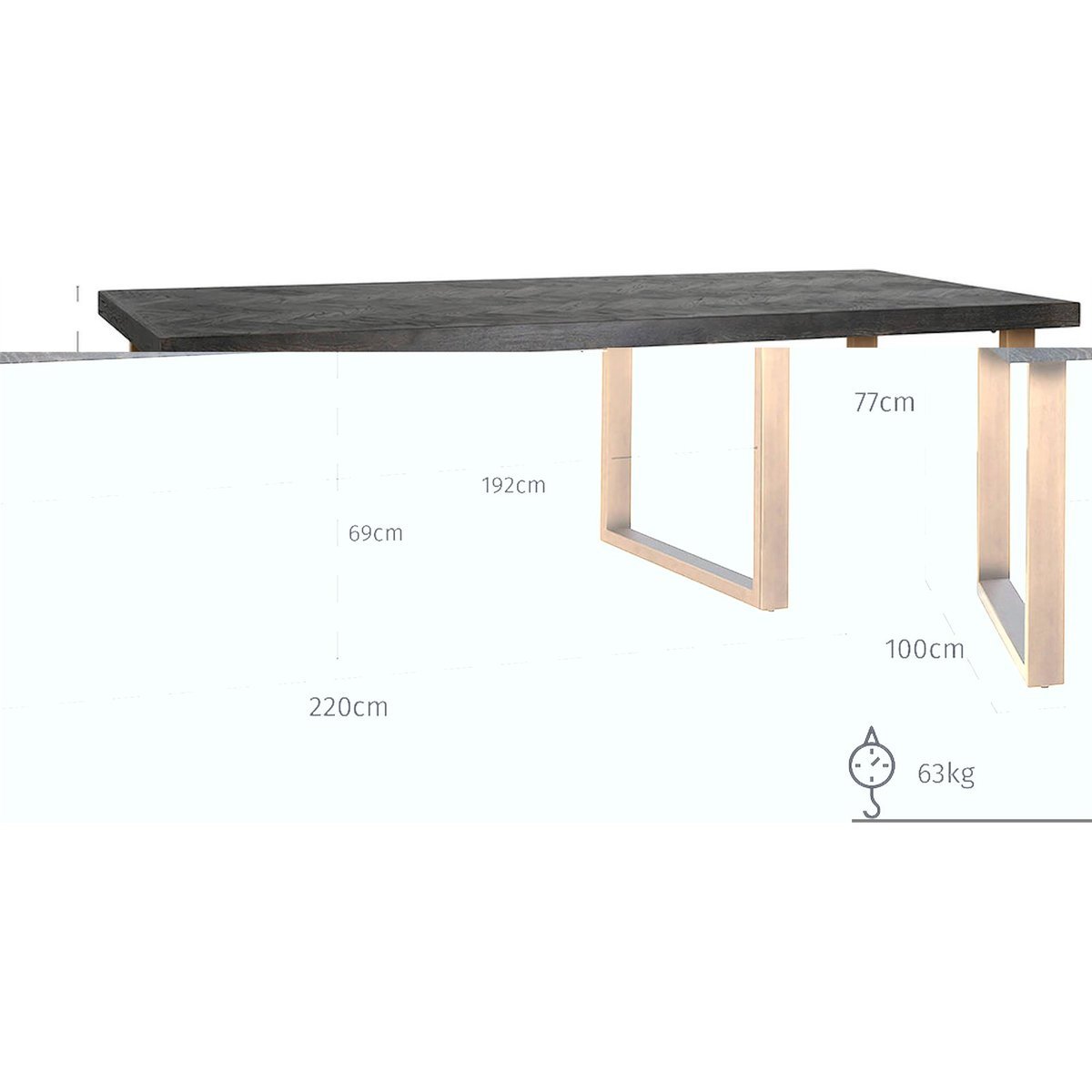 Measuring 220 x 100 x 77 cm, the table offers ample space for dining essentials, centerpieces, and tableware, making it a versatile choice for both everyday meals and special occasions. Its sleek design adds a modern touch, while the sturdy construction ensures long-lasting durability and stability, even in busy households. The clean lines and bold black-and-gold tones make this table a striking piece that easily complements contemporary, urban, or industrial interiors.