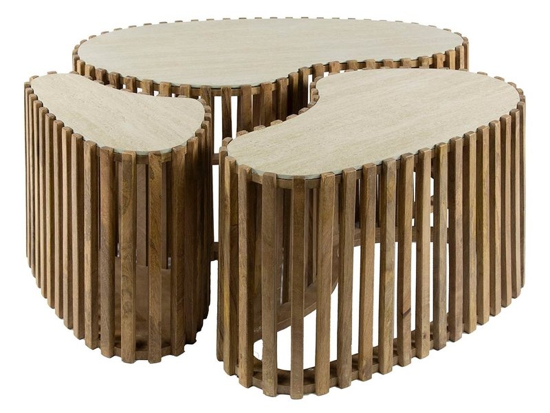 Les plateaux en céramique 3D effet travertin offrent une finition minérale raffinée qui évoque la pierre naturelle, tout en étant résistante à l’humidité et aux rayures. Ce matériau haut de gamme garantit une excellente durabilité au quotidien, tout en apportant luminosité et sophistication à votre espace de vie. Chaque plateau repose sur une structure robuste en bois massif de manguier, une essence reconnue pour sa solidité, sa stabilité et son veinage naturellement chaleureux.