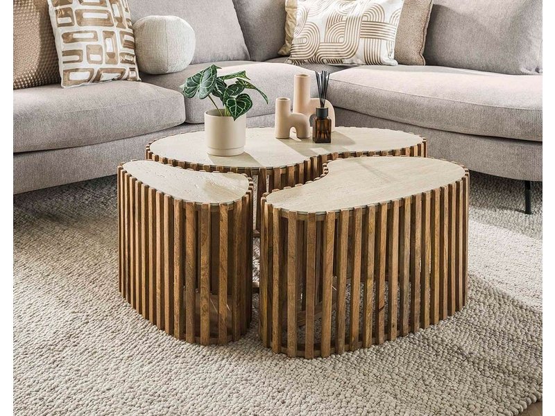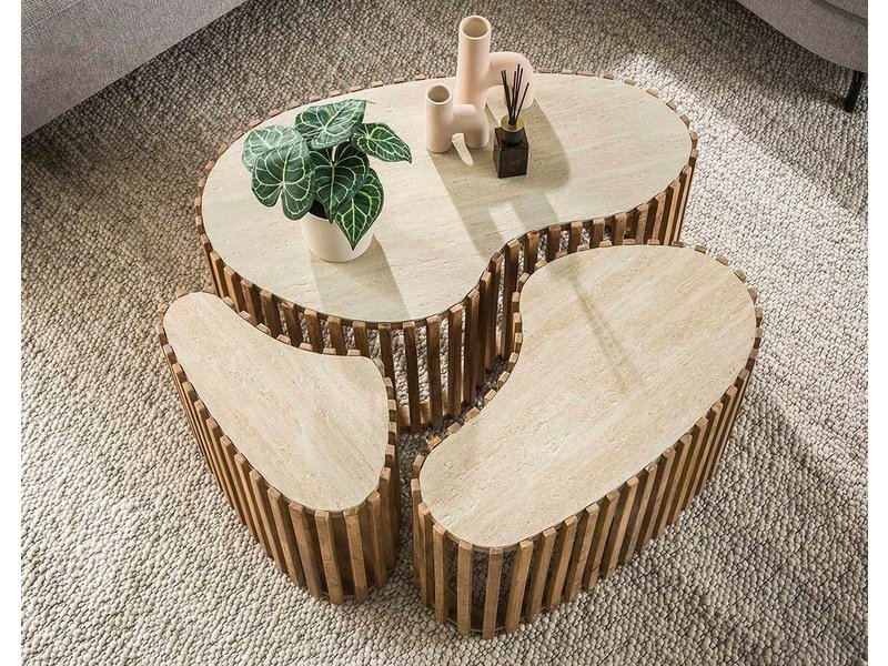 Grâce à leur conception gigogne, ces tables basses peuvent être utilisées ensemble pour créer un ensemble harmonieux ou séparément afin de répondre à différents besoins : table basse centrale, table d’appoint ou support décoratif. Leurs dimensions variées offrent une grande liberté d’agencement, idéale pour optimiser l’espace dans un salon.