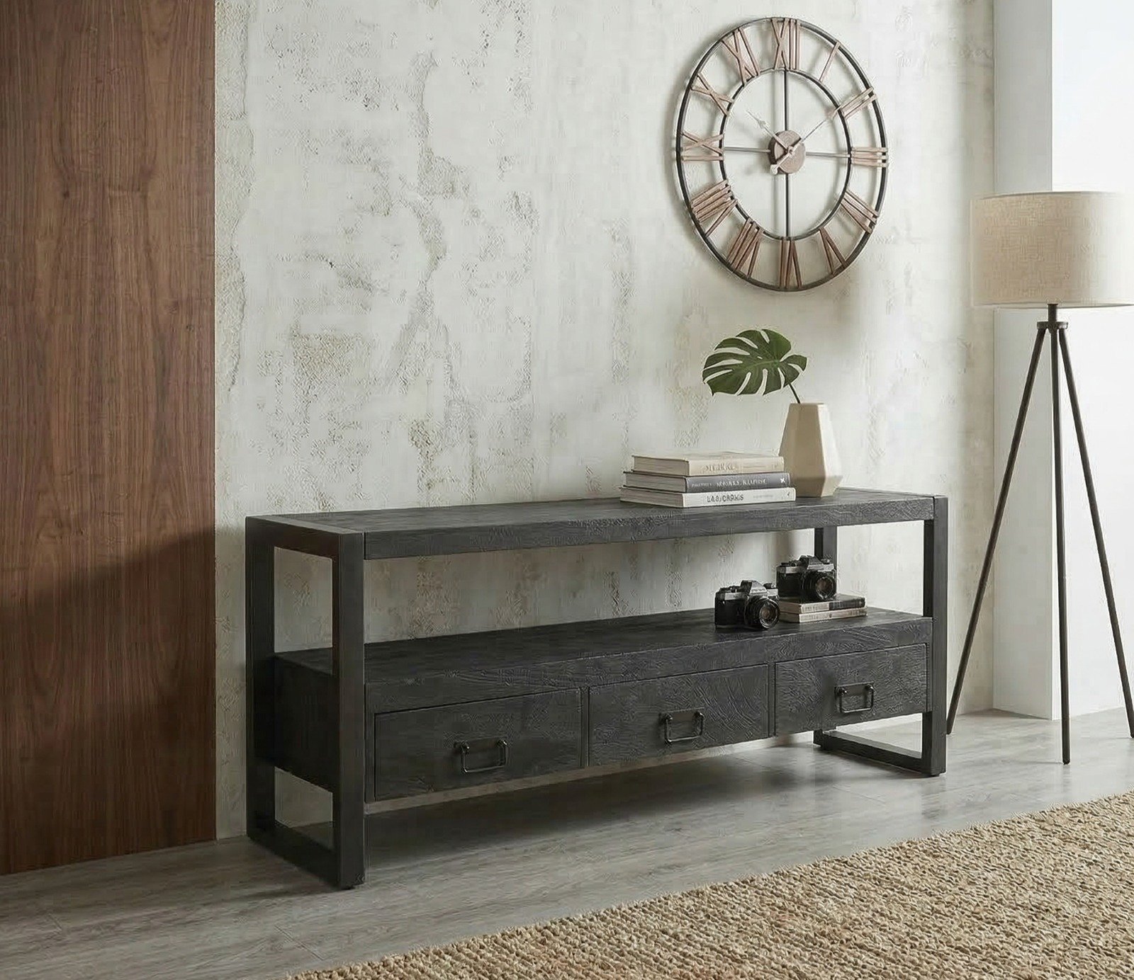 The TV Cabinet 150 cm Black (Solid Wood) is a striking and practical addition to any modern or industrial living space. Its refined design harmoniously combines black wood and black steel, creating a sleek, cohesive look that complements your television and enhances the overall aesthetic of the room. This TV cabinet not only delivers on style but also offers plenty of functionality, with three spacious drawers and an open compartment in the middle to store all your media equipment, remotes, and other essentials.