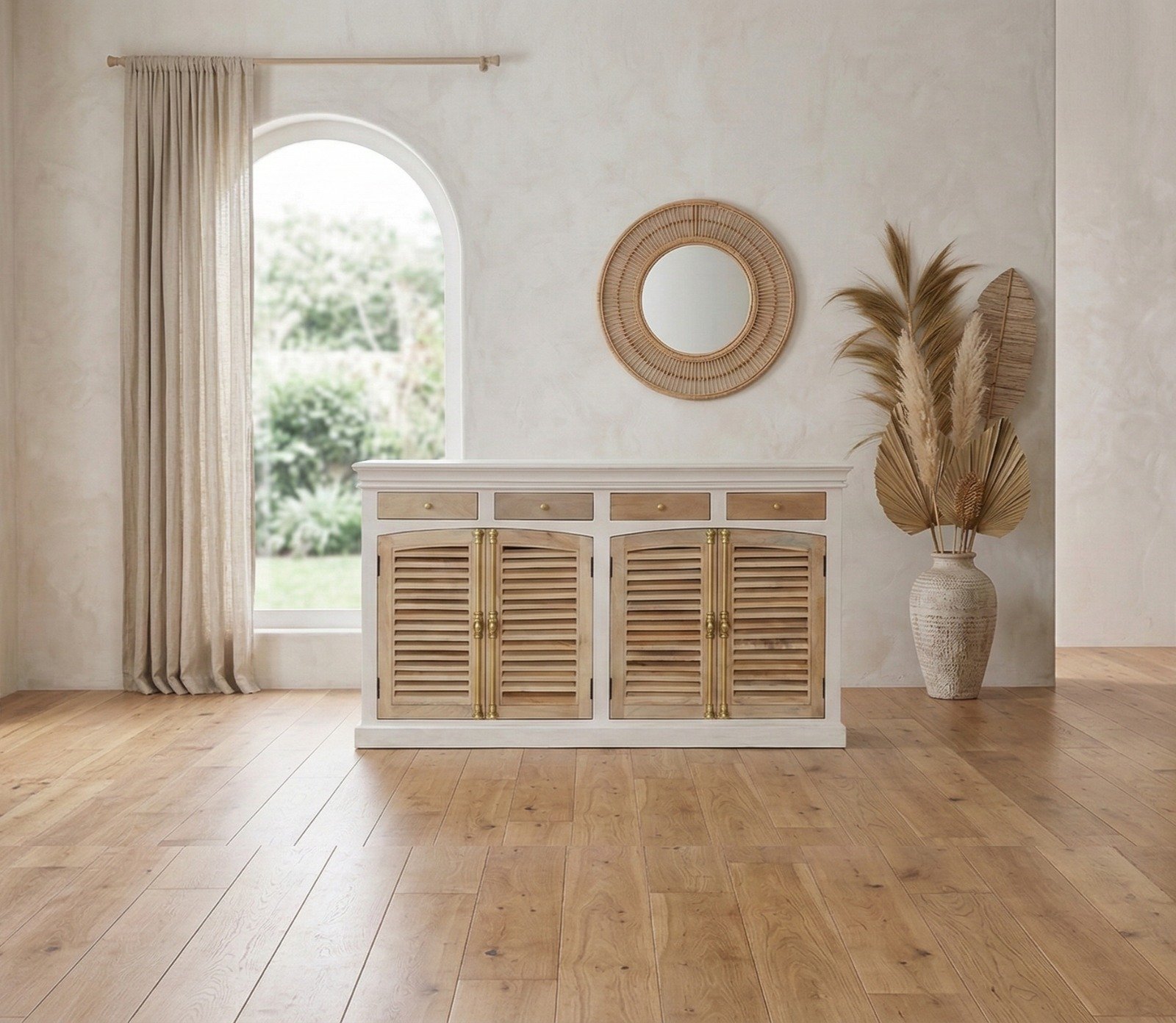 Finish: The dual-tone palette highlights the natural textures of solid wood while adding depth and sophistication. This versatile finish makes the Wooden Two-Tone Shutter-Style Sideboard suitable for farmhouse, coastal, rustic, and transitional interiors.