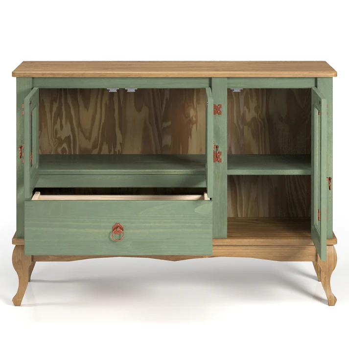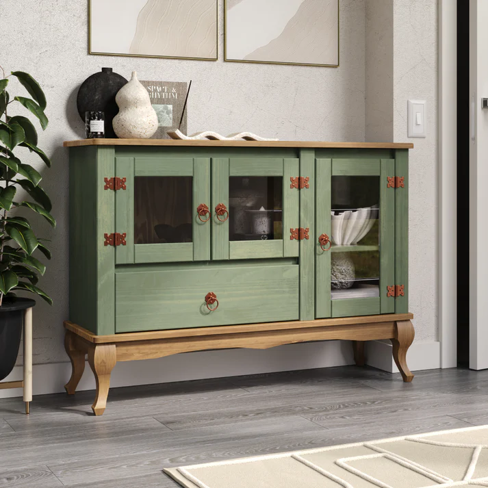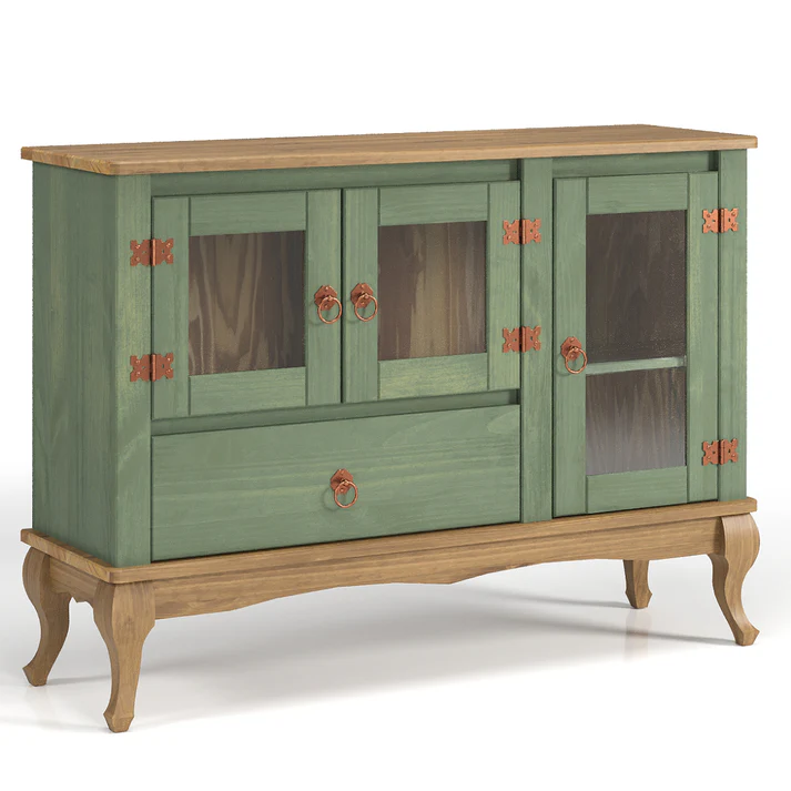 This sideboard features three glass-paneled cabinet doors with decorative bronze-style hinges that enhance its traditional aesthetic. The transparent panels allow you to showcase dishes, collectibles, or décor items while keeping them protected from dust. In addition, the piece includes a spacious lower drawer, ideal for storing linens, utensils, books, or everyday essentials. Each door and drawer is fitted with elegant ring-pull handles for easy access and a refined finishing touch. Vintage Green Wood Sideboard