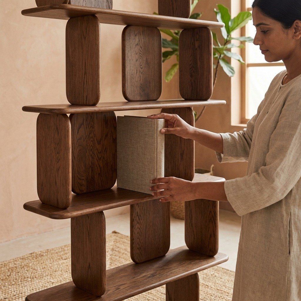The Virello Wooden Bookshelf (Solid Wood) is a stunning fusion of sculptural design, organic textures, and geometric precision, making it a versatile centerpiece for any home. Expertly handcrafted from solid wood, this bookshelf showcases smooth rounded panels contrasted with sturdy vertical supports, creating a visually captivating balance of form and function.
