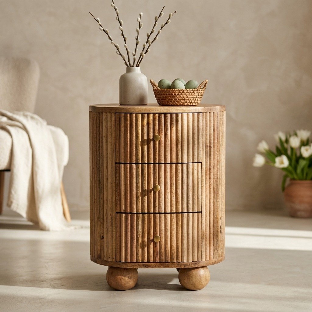 The PRITI Wooden Ball 3 Drawer Bedside Table (Solid Wood ) is a stunning piece that brings both practicality and modern elegance to your bedroom. Crafted from 100% solid wood, this bedside table boasts a lovely natural finish that enhances the rich grain and texture of the wood, adding warmth and a timeless appeal to your space.