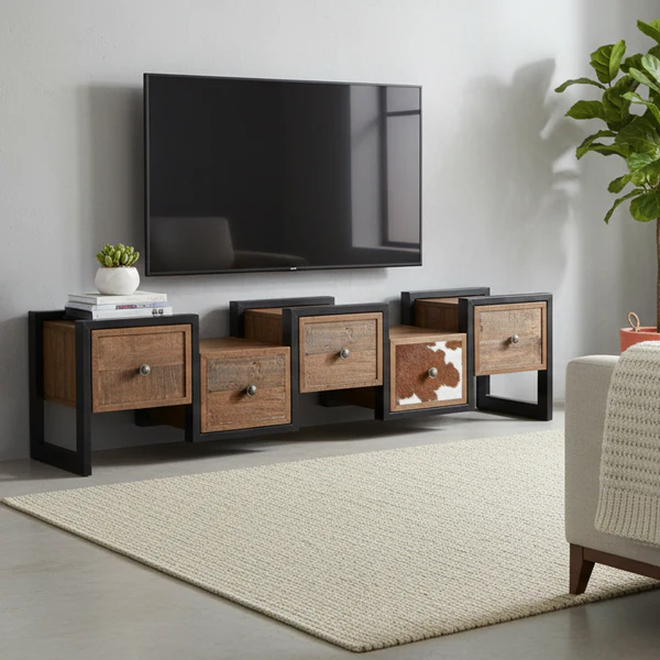 The combination of mango wood, natural leather accents and black metal legs creates a stylish contrast between rustic charm and modern industrial design. The sturdy metal legs provide excellent stability and durability, ensuring long-term everyday use. Versatile and elegant, this zigzag TV stand fits seamlessly into modern, industrial or eclectic interiors.